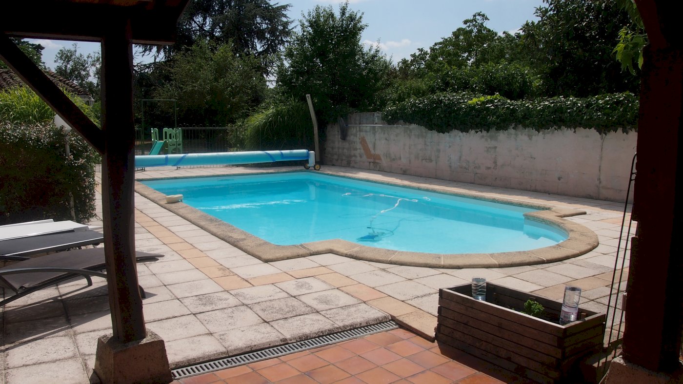 L'espace extérieur offre une terrasse ouverte et une autre couverte ; très agréable lors des fortes chaleurs en été. Depuis les terrasses, on accède à la piscine de 8 m sur 4,5 m. cet espace est entièrement clos et la mitoyenneté est sans vis-à-vis.