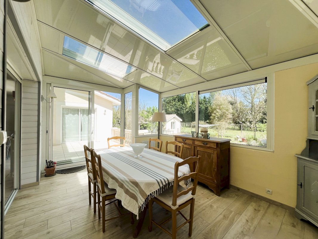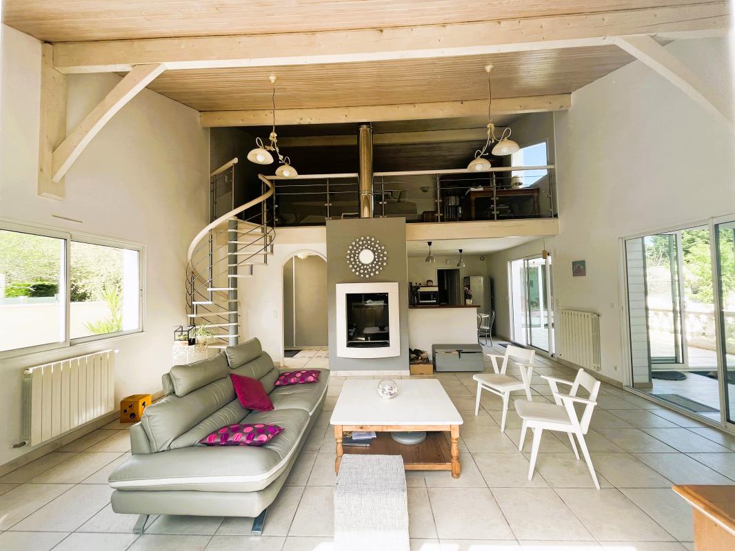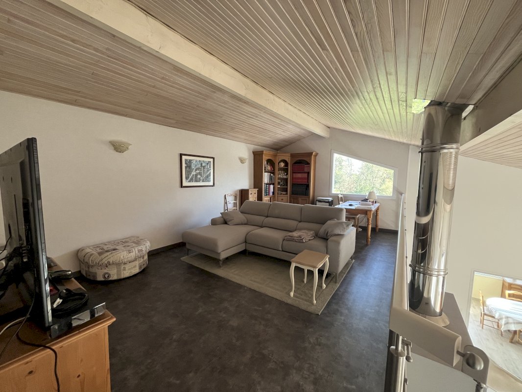 Elle se compose d’un grand séjour avec cuisine ouverte avec cellier, elle bénéficie d’une belle luminosité grâce à son plafond cathédrale, une vaste mezzanine, sa triple exposition : Est/sud/ouest et une véranda isolée et chauffée donne une vue imprenable sur le jardin verdoyant et sans vis-à-vis. L’espace nuit se compose de 4 chambres avec espaces de rangement et d’une grande salle de bain.