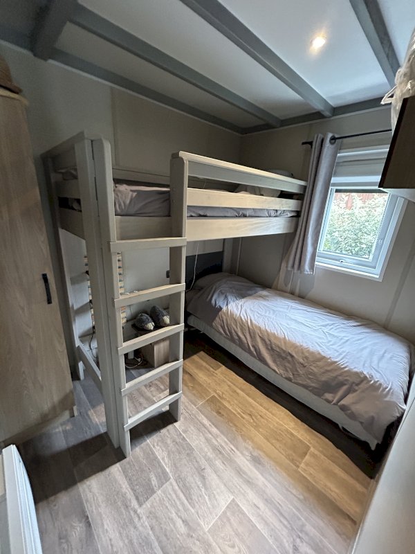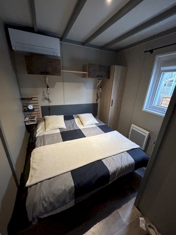 Chalet bois avec 3 chambres - Espace de vie tout équipé avec cuisine - Salle d'eau - WC séparé - 2 terrasses dont une carrelée et couverte - Terrain 200 m² clôturé ombragé au calme avec vue sur la forêt - 2 places de parking - 2 climatiseurs réversibles + radiateur chauffant - 1 abri de jardin.