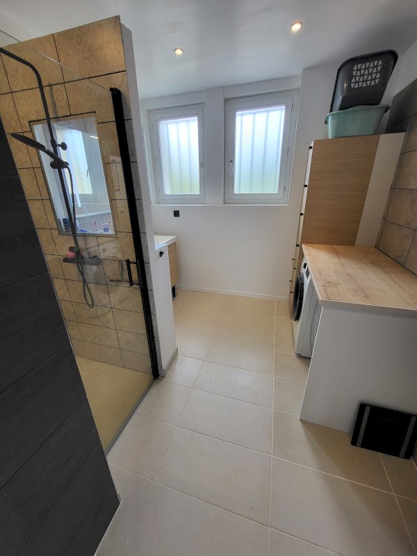 En rentrant un couloir dessert une chambre de 13 m² avec placard intégré, la salle de bain douche italienne, le WC, une 2ème chambre de 20 m², puis on arrive à l'espace cuisine de 25 m² ouverte sur le salon et la terrasse et balcon, le tout plein sud.