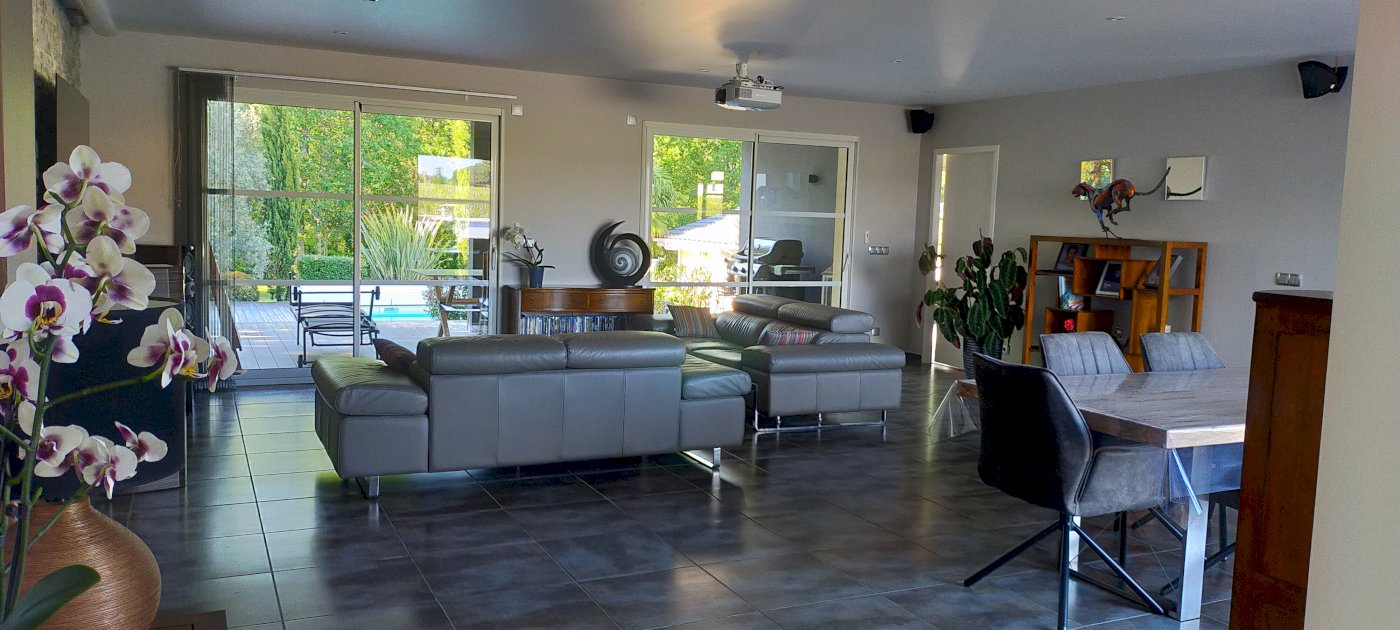 Maison contemporaine de plain-pied de 2010, très lumineuse avec sa double exposition, de 168m² avec jardin paysagé de 1500m² doté d’un arrosage automatique, alimenté par un puit.