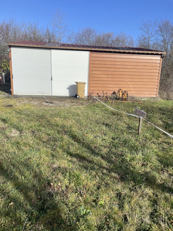 HANGAR quasiment neuf indépendant de 84 m², et 8,10m en façade x 10.30m de profondeur environ, une hauteur libre 3,90 m de implanté à 25 mètres environ de la façade arrière de la maison, il est construit en charpente et ossature métallique, couverture en bac acier et bardage extérieur décoratif le tout isolé, sol en beton, éclairage néon intérieur et projecteur extérieure, prise de courant, tableau électrique de protection, 2 grand portail d'acces.