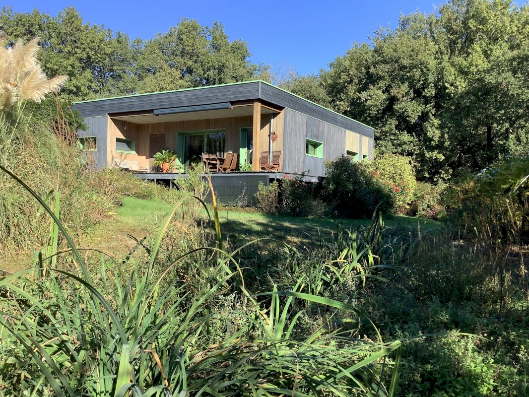 Maison en bois écologique et saine, construite entre 2013 et 2015, bardage en mélèze, sur pilotis, menuiseries en bois/alu avec volets roulants, grande baie vitré au sud avec terrasse couverte, dans un paysage préservé entouré des champs bios, vue sur la vallée de la Garonne et les Pyrénées, récupération d'eau de pluie, toiture terrasse, assainissement par filtres plantés.