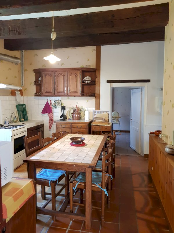 Salon/salle à manger avec cheminée fonctionnelle, cuisine séparée et équipée, salle d'eau, WC indépendant, et grande chambre. chauffage central au fioul.