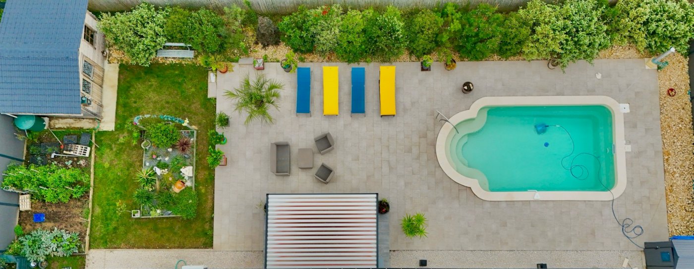 Climatisée et traversant avec accès sur terrasse avec une pergola bioclimatique et piscine.