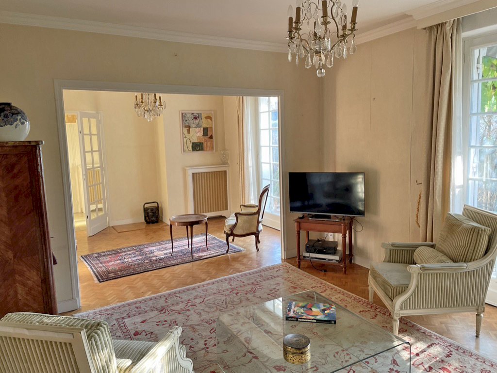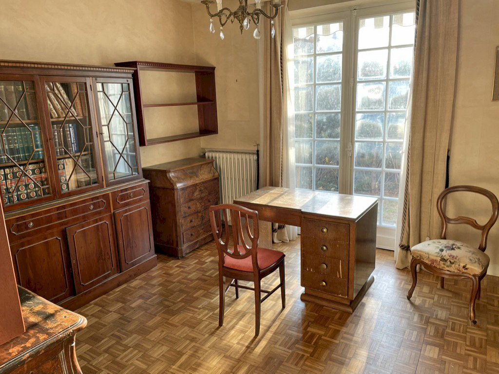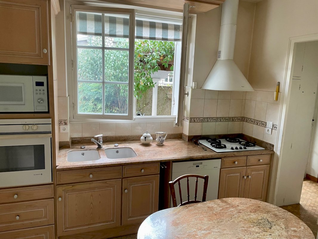 Marmande (47200), maison de caractère 1970, sur terrain de 507 m², 2 étages, séjour et salon lumineux avec stores electriques, salle a manger, cuisine et buanderie equipées, bureau, 5 chambres, balcon, vaste salle de jeu, 2 SdB, 2WC independants, garage couvert attenant, grande cave, jardin clos avec figuier, patio calme et fleuri avec tonnelle, arrosage automatique, tout a l'égout. Air conditionné reversible partout sauf 3 chambres, chauffage central au gaz.