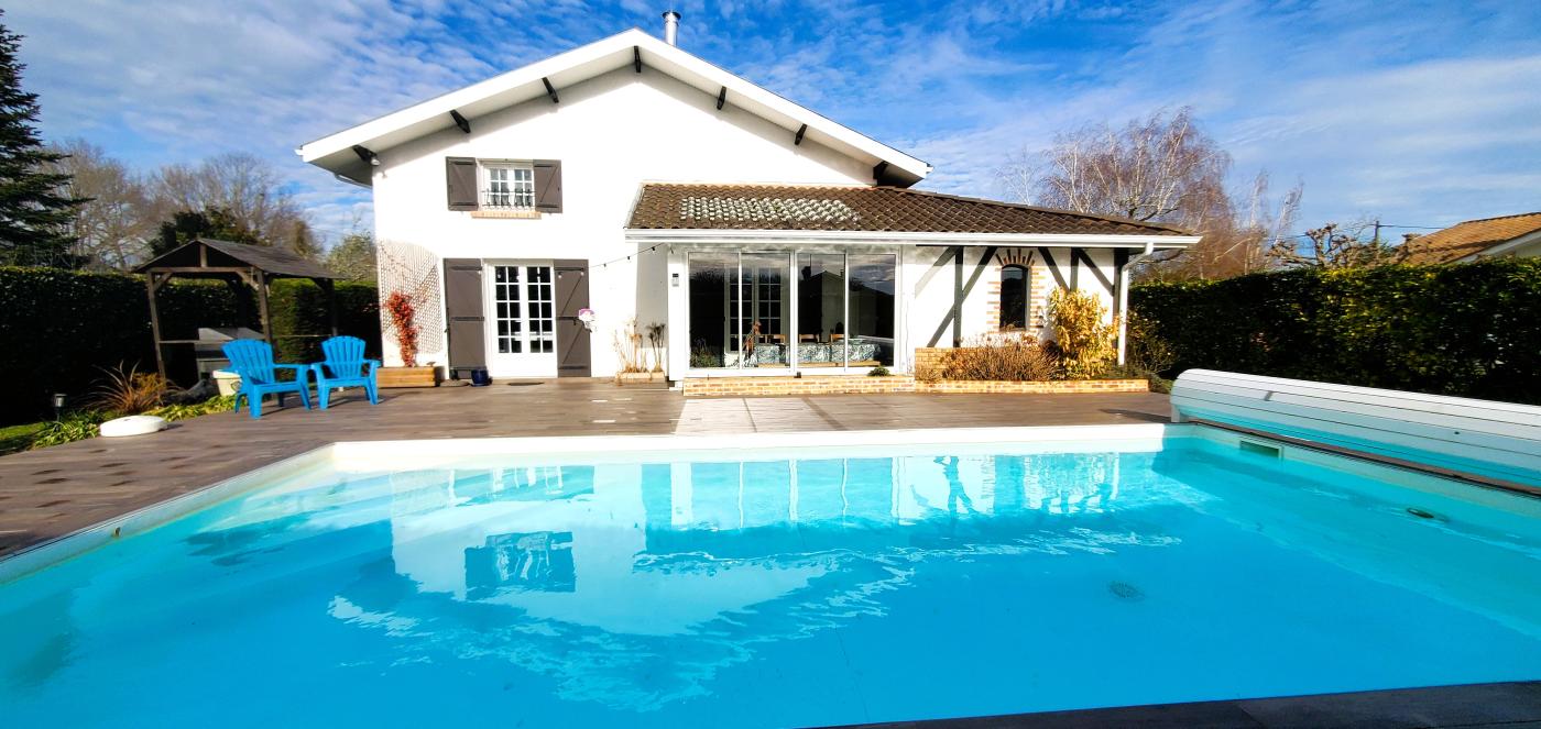 Bien de 250 m² + véranda 30 m² + garage 32 m² aménageable en studio + jardin 1460 m² au calme + piscine 8/4 (sel ou chlore au choix) plein Sud avec volet roulant, sans vis-à-vis.