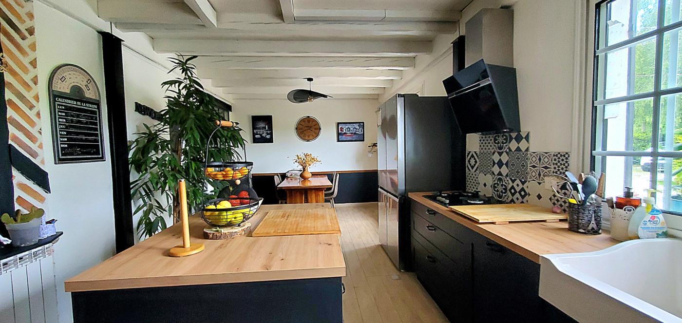 RDC : Salon de 48 m2 avec cheminée insert, plafond cathédrale. Cuisine américaine rénovée, électroménager sous garantie. Buanderie. Entrée. 2 chambres. 1 salle d'eau. WC. Poutres apparentes. Chaudière gaz.