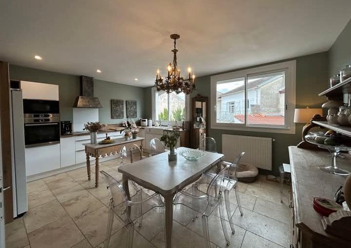 Maison centre ville composée d'une cuisine équipée de qualité, d'un salon avec cheminée, d'une cuisine d'été, de trois chambres avec placards, de deux salles de bain, d'un balcon, d'une terrasse, d'un grand garage et d'une cave.