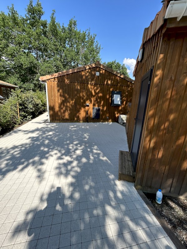 Chalet bois avec 3 chambres - Espace de vie tout équipé avec cuisine - Salle d'eau - WC séparé - 2 terrasses dont une carrelée et couverte - Terrain 200 m² clôturé ombragé au calme avec vue sur la forêt - 2 places de parking - 2 climatiseurs réversibles + radiateur chauffant - 1 abri de jardin.