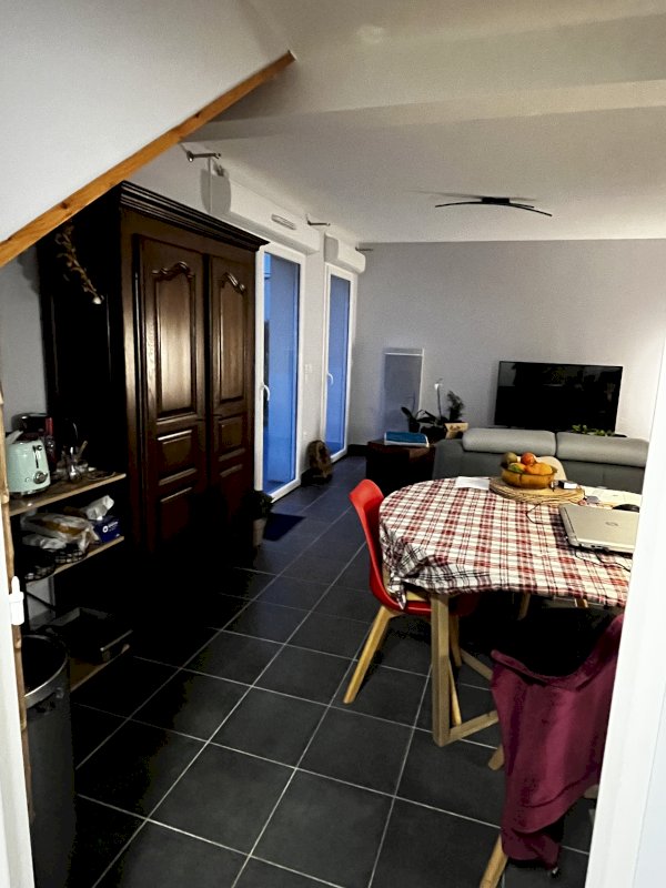Au rez de chaussée, une cuisine équipée (four, lave-vaisselle, lave linge, plaque à induction, réfrigérateur et hotte) s’ouvre sur un séjour / salon, nouvellement repeint.