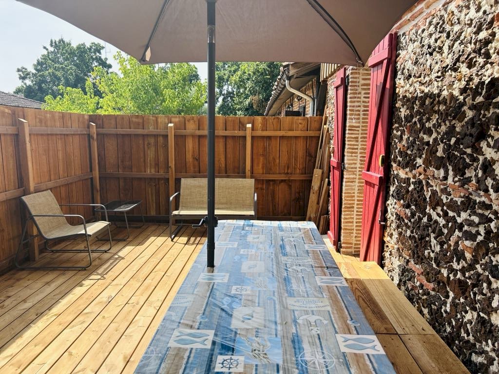 Jardin nord de 100 m², partiellement couvert, parfait pour profiter de l’ombre et de la fraîcheur lors des journées chaudes.