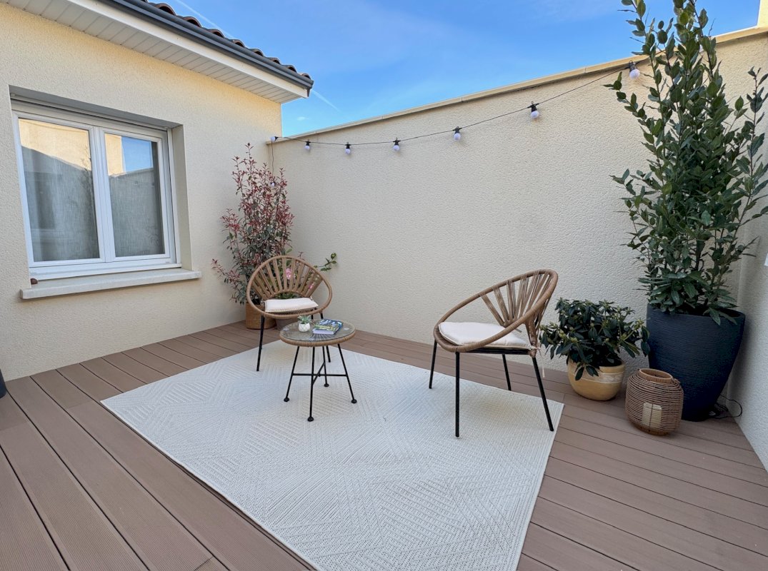 À l’extérieur, le terrain de 460 m² entièrement clôturé propose deux terrasses, dont une avec pergola bioclimatique (stores et éclairage intégrés), un patio en bois composite et un jardin paysagé.