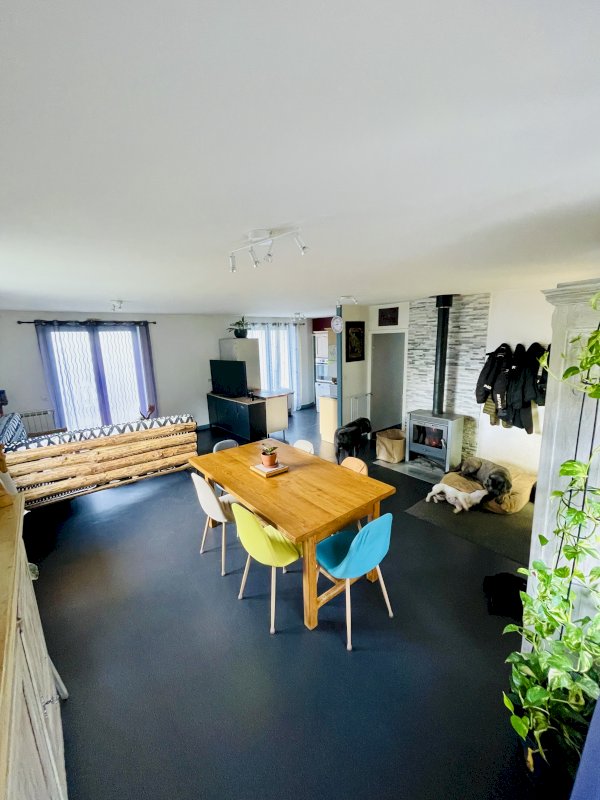Une grande pièce à vivre (salon, salle à manger et cuisine équipée).