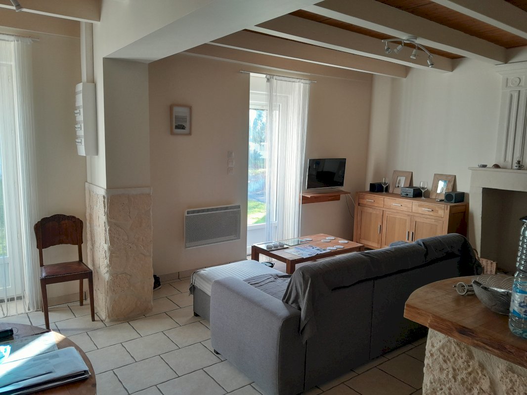 Vente maison : Dans hameau à 700m du bourg de Corme-Royal muni de nombreux commerces, à 12 km de Saintes, maison charentaise rénovée en partie basse sur 83 m² : Entrée, séjour avec cuisine ouverte aménagée, salle eau avec douche italienne et wc, chambres 1 et 2 ou bureau. Garage avec mezzanine, grand grenier double exploitable sur 85 m².