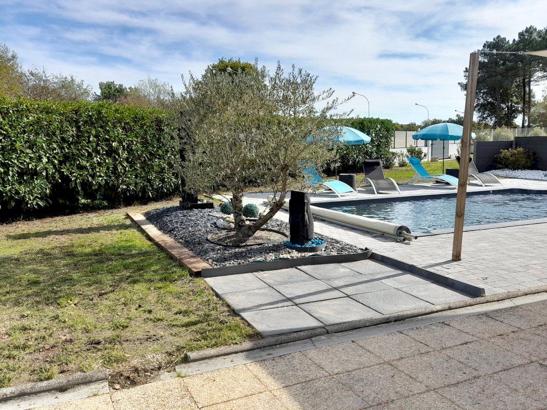 Une piscine au chlore avec pompe à chaleur de 8 m x 4 m avec balnéo ainsi qu une table intégrée pour savourer un apero et d une terrasse.