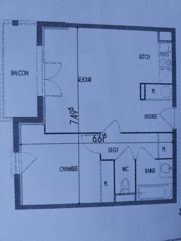Se compose d'une entrée + placard, cuisine ( kitchenette) ouverte sur séjour, dégagement avec placard pour accès coin nuit. Une chambre de 11.30 m², salle de bain( baignoire) et wc séparé. Balcon de 5.20 m².