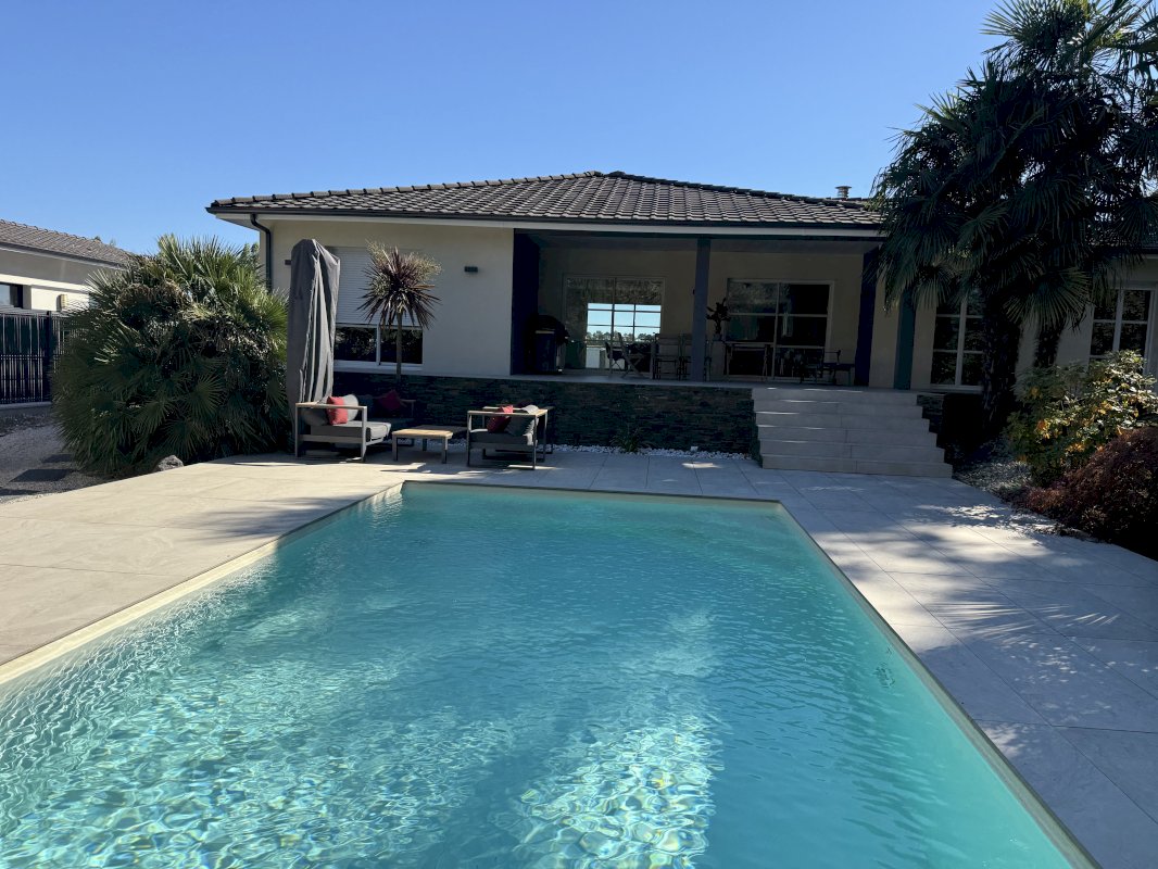 Maison contemporaine de plain-pied de 2010, très lumineuse avec sa double exposition, de 168m² avec jardin paysagé de 1500m² doté d’un arrosage automatique, alimenté par un puit.