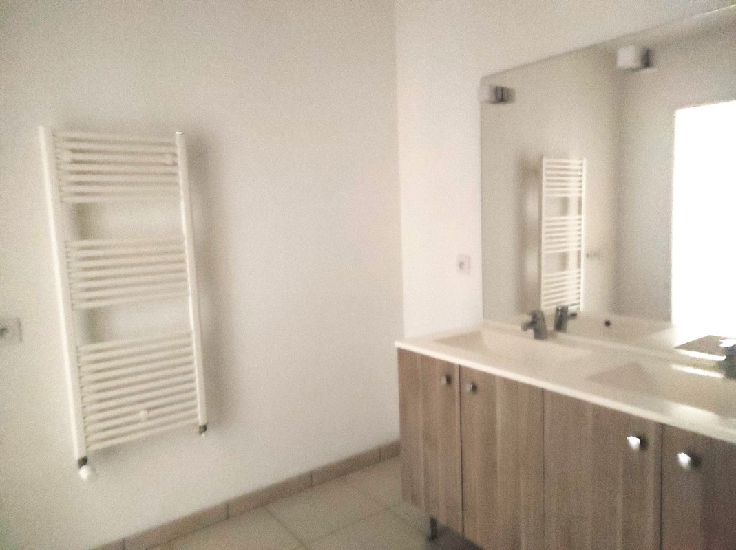 Entrée donnant sur les trois chambres avec placard intégré, WC séparés, grande salle de bain avec baignoire-douche et espace de rangement, puis sur un grand salon-salle à manger avec cuisine ouverte, complètement cerclé d’un large balcon-terrasse avec occultant. Ce grand espace de vie donne sur les espaces jardin et parking, tranquille et isolé de tout regard.