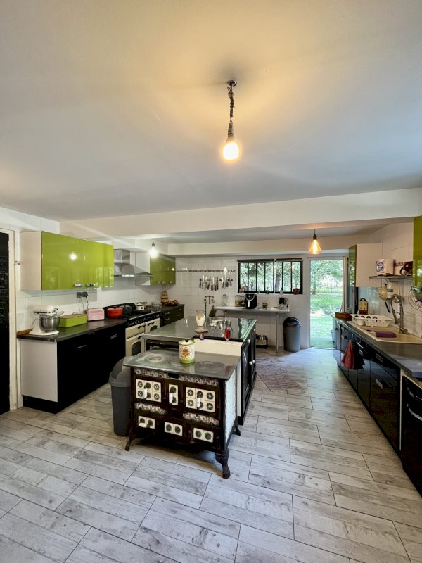 Grande entrée/salon chaleureux doté d'un insert double face d'1,20M, grande cuisine équipée, grand séjour.