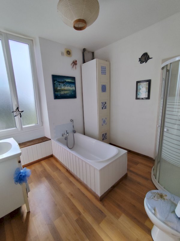 **Étage** : 3 chambres dont une grande suite parentale avec salle d'eau (douche WC), deuxième salle de bain avec baignoire douche et wc.