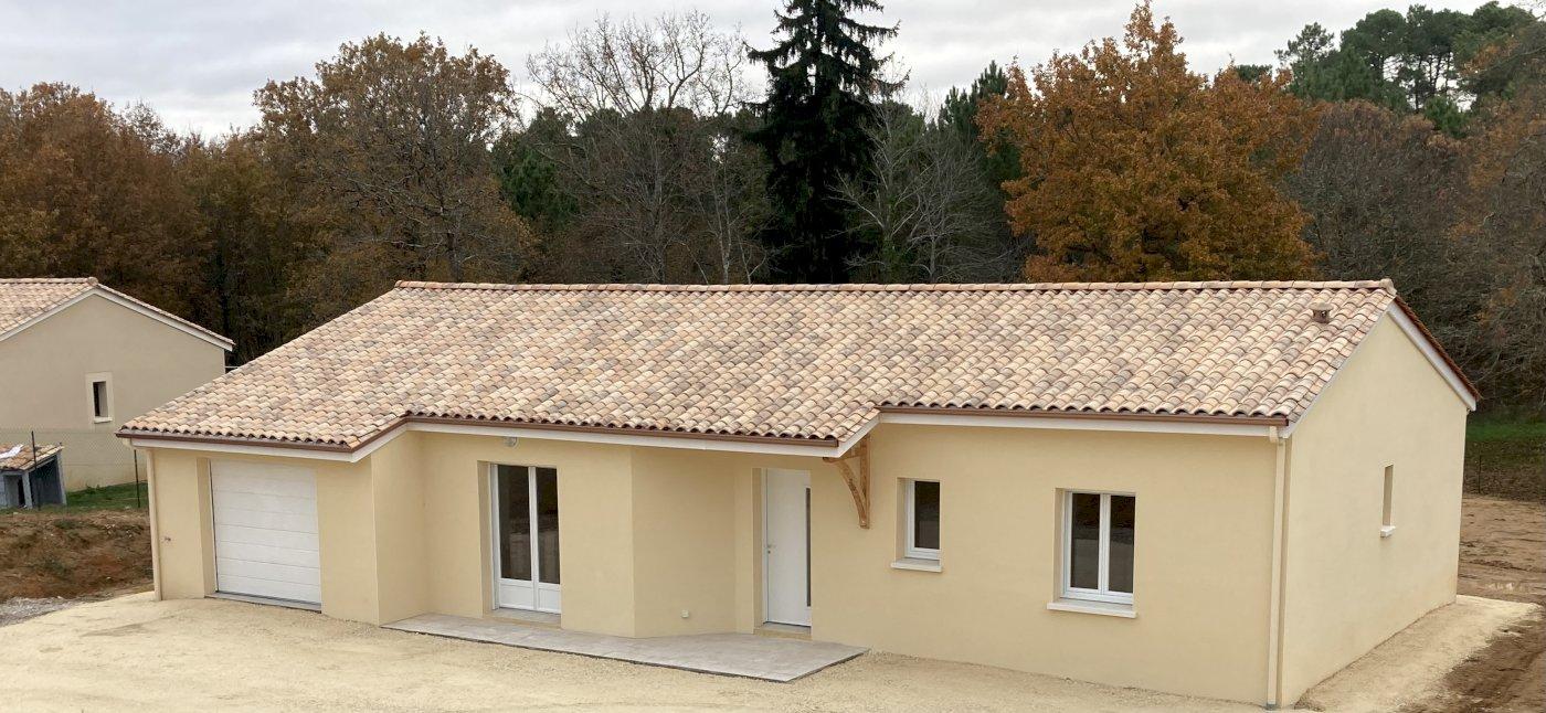 Maison de plain-pied sur 1250 m² de terrain avec trois chambres, un grand salon, salle à manger cuisine cellier, garage 30 m², salle de bain, WC avec fenêtre, extérieur, peinture intérieure, blanc Maison neuve avec décennale.