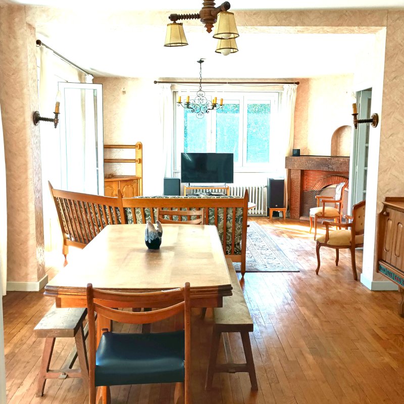Sa superficie est d’environ 132.50 m², plus un plateau d’environ 60 m² aménagé en 6 espaces de nuit lambrissés au 2eme étage. La maison peut être partiellement meublée.