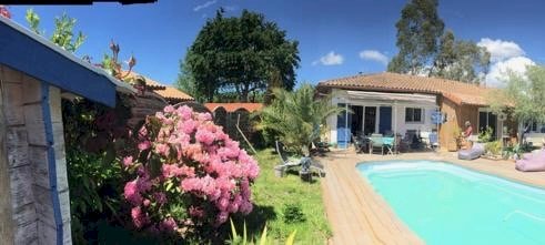 Maison au calme, centre-ville Biscarrosse bourg, 720 m² terrain, véranda, piscine, 2 salles d'eaux, 3 chambres et 1 bureau.