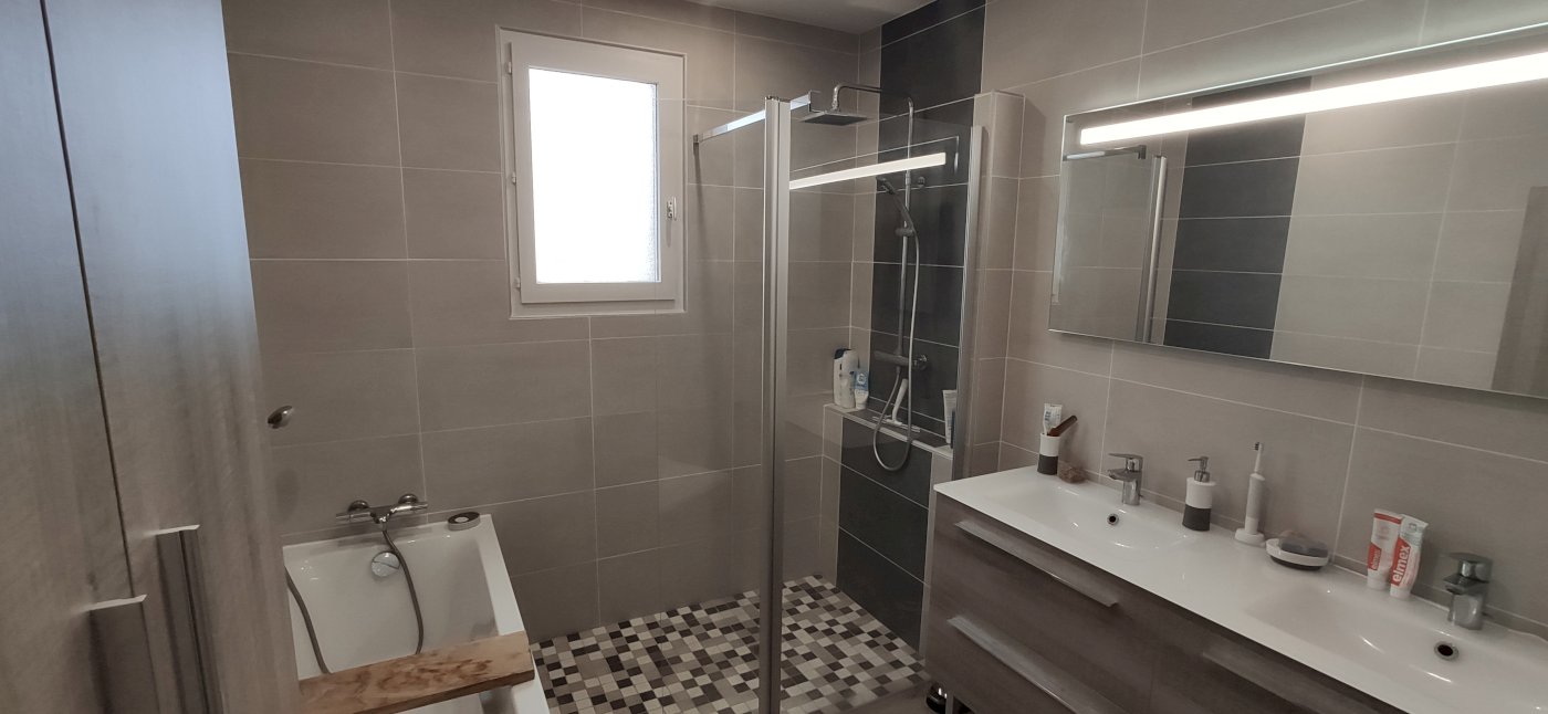 Puis, espace nuit avec une salle de bain de 7 m² avec baignoire et douche. 2 chambres de 10 m² avec placard intégré. Et, au bout du couloir, une grande suite parentale de presque 19 m² avec grand placard, salle d’eau (douche à l’italienne) et WC.