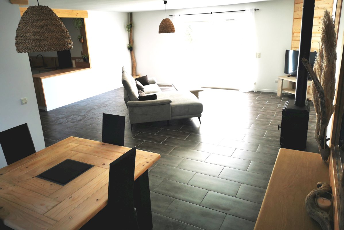 Vous trouverez au RDC: une entrée avec placards, un wc, une chambre avec placards et sa propre salle d'eau, un grand séjour (avec poêle à bois) et une cuisine ouverte d'environ 60m², une grande buanderie et un grand garage.