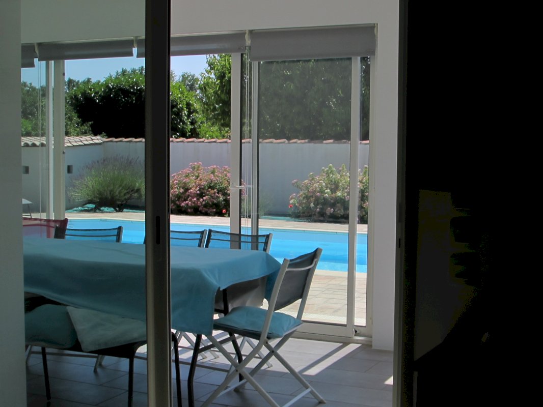 Une piscine de 9 X 4 m chauffée, sécurisée par volet flottant motorisé et caillebotis PVC (aux normes NFP 90-308), entourée d'une terrasse réalisée d'un béton décoratif.