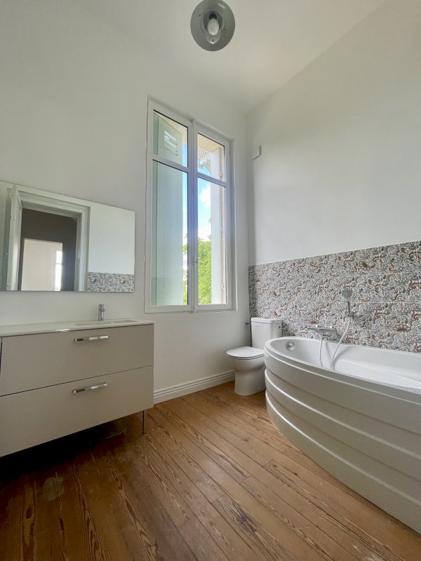 Elle se compose d’une grande entrée de deux vastes pièces de réception en enfilade ouvertes sur le parc arboré et dominant la Garonne, un bureau, une cuisine indépendante.