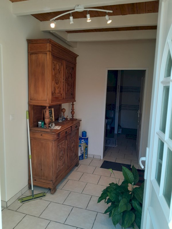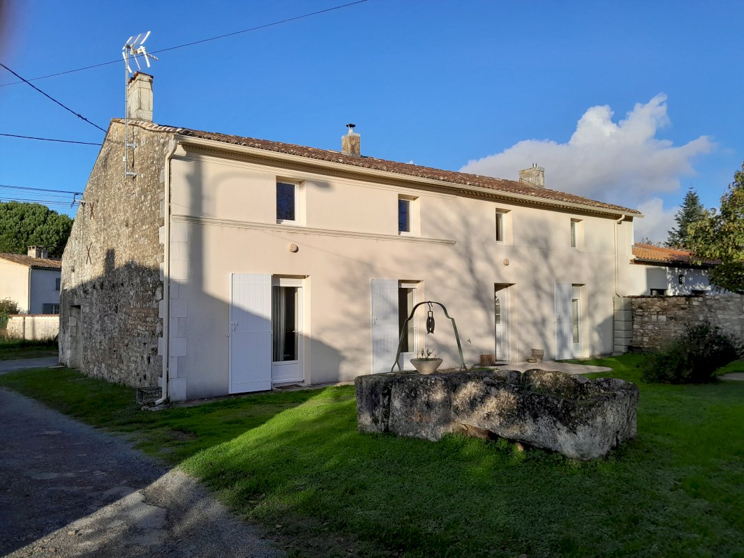 Vente maison : Dans hameau à 700m du bourg de Corme-Royal muni de nombreux commerces, à 12 km de Saintes, maison charentaise rénovée en partie basse sur 83 m² : Entrée, séjour avec cuisine ouverte aménagée, salle eau avec douche italienne et wc, chambres 1 et 2 ou bureau. Garage avec mezzanine, grand grenier double exploitable sur 85 m².
