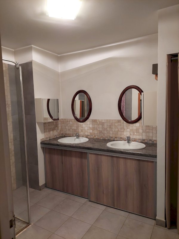 - Au rez-de-chaussée : salon-séjour avec une cuisine ouverte, une grande chambre, un dégagement avec placard, une salle d'eau avec double vasques et douche à l'italienne, une buanderie et WC séparé.