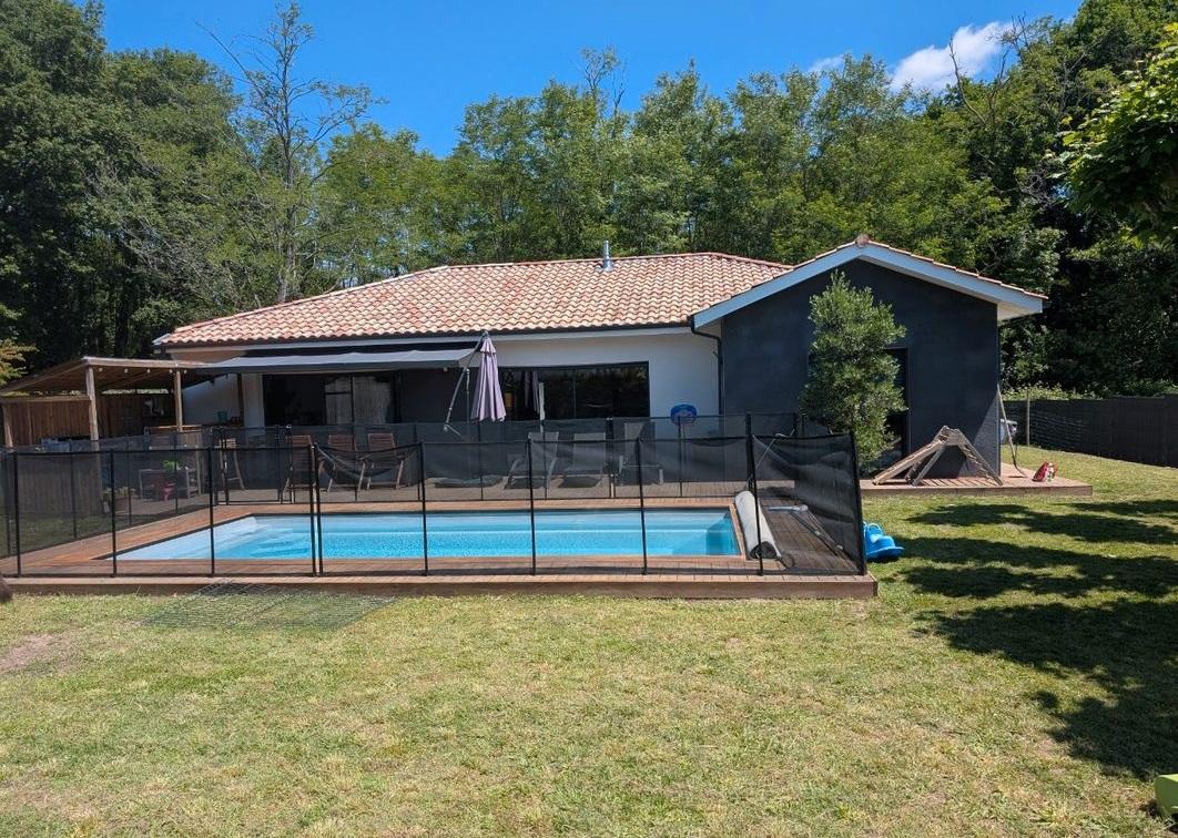 Bonjour, nous vendons notre maison située à Pontonx l'Adour dans quartier très calme. Notre maison de 2021, DPE A est d'une superficie de 115 m² + 15 m² de garage sur un terrain de 750 m² entièrement clôturé avec portail électrique.