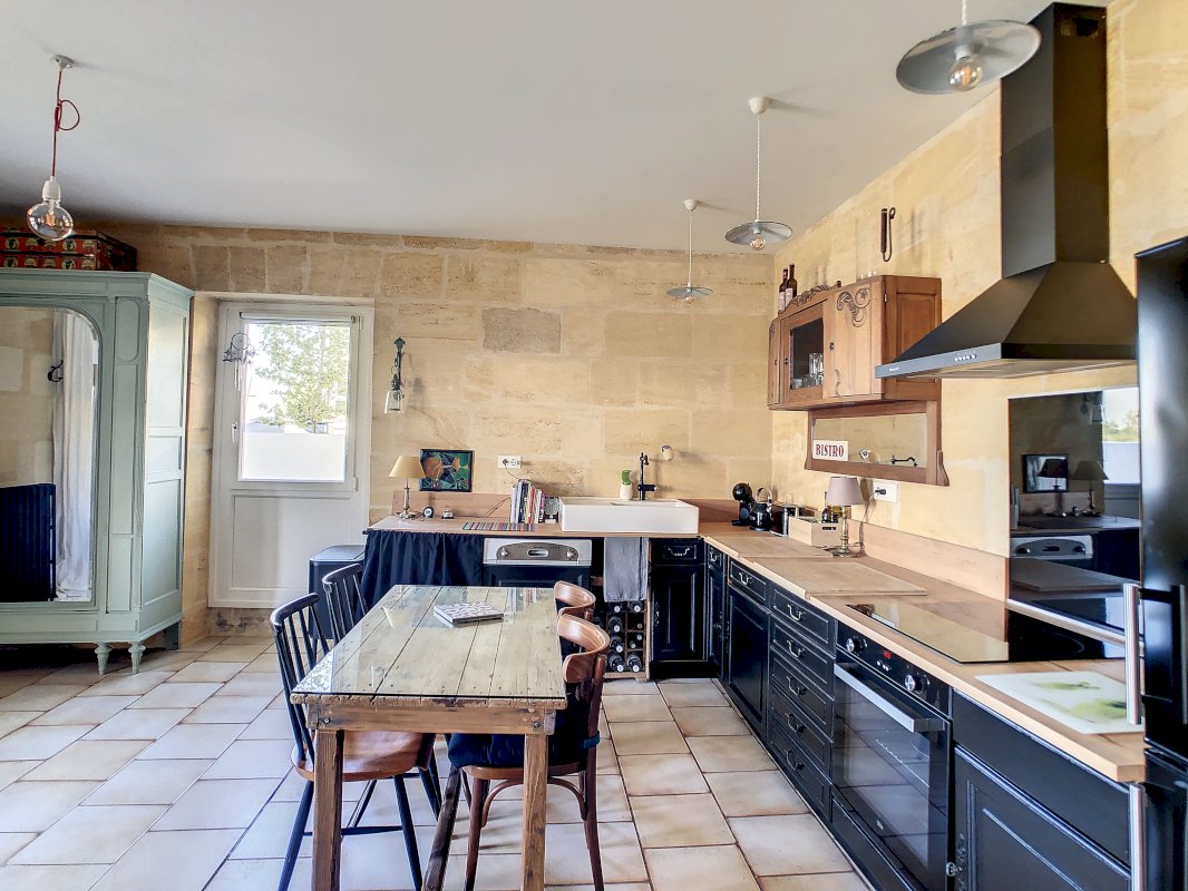 La cuisine aménagée ouverte sur le salon est toute équipée ; évier chiné, (plaque vitrocéramique neuve, hotte aspirante, four, réfrigérateur (peu utilisés), machine à laver, lave vaisselle, four à micro ondes, meubles anciens et armoires de rangement délicatement repeints