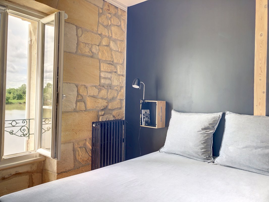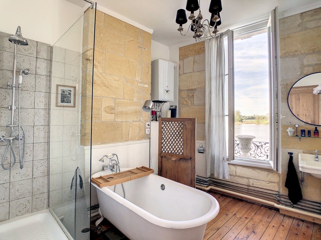 Une salle de bain de 9m2 est attenante avec pour seul vis à vis la Garonne, baignoire en fonte rapportée et restaurée, douche à l’italienne, lavabo chiné, wc, sol en parquet et apparence de deux murs en pierre