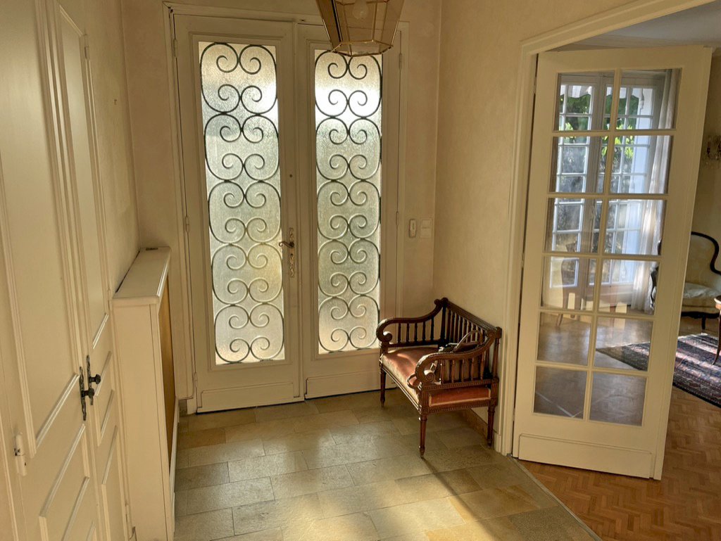 Marmande (47200), maison de caractère 1970, sur terrain de 507 m², 2 étages, séjour et salon lumineux avec stores electriques, salle a manger, cuisine et buanderie equipées, bureau, 5 chambres, balcon, vaste salle de jeu, 2 SdB, 2WC independants, garage couvert attenant, grande cave, jardin clos avec figuier, patio calme et fleuri avec tonnelle, arrosage automatique, tout a l'égout. Air conditionné reversible partout sauf 3 chambres, chauffage central au gaz.