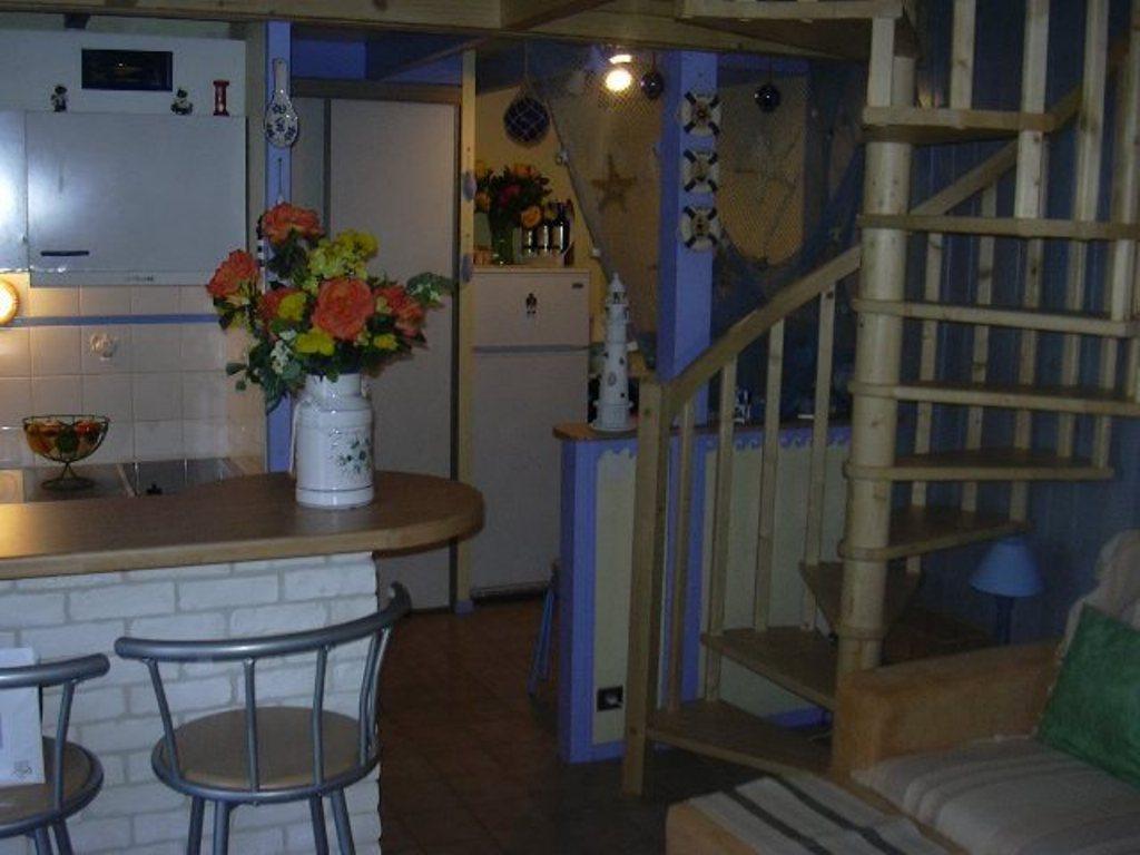 • Rez-de-chaussée : pièce de vie (meuble table vaisselier; meuble de coin; bar avec deux tabourets) coin kitchenette avec plaque vitro céramique (2 feux) hotte aspirante, meubles hauts et bas; dégagement avec placard, salle d'eau (douche ; meuble vasque; colonne et wc.