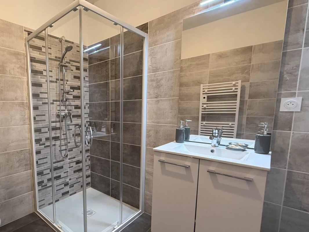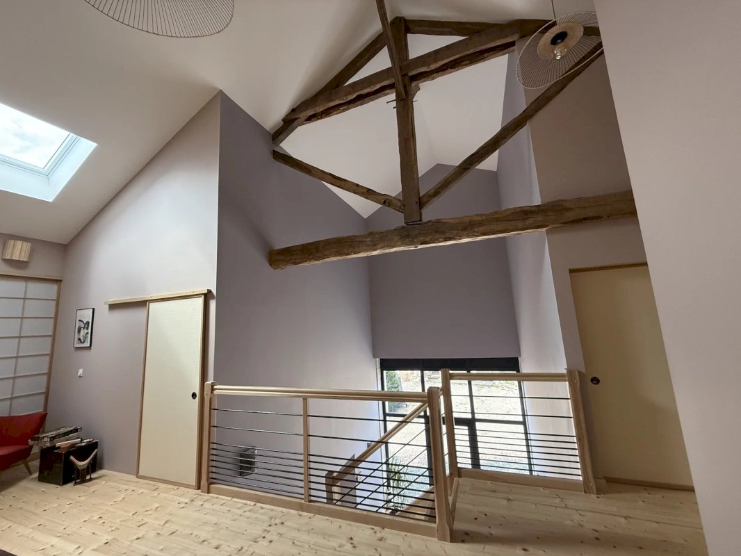 L'entrée majestueuse avec une hauteur sous plafond de 10 m dessert 2 chambres 27 et 17 m² avec salle d'eau, une cuisine buanderie de 10 m², une salle à manger de 17 m² attenant à cette pièce une grange en pierres de 31 m² avec ancien pigeonnier de 20 m² peut facilement être reliée à la maison pour l'agrandir. On accède à l'étage par un bel escalier en frêne, la mezzanine de 24 m² dessert 3 chambres de 17 à 15 m², chacune avec sa salle d'eau.