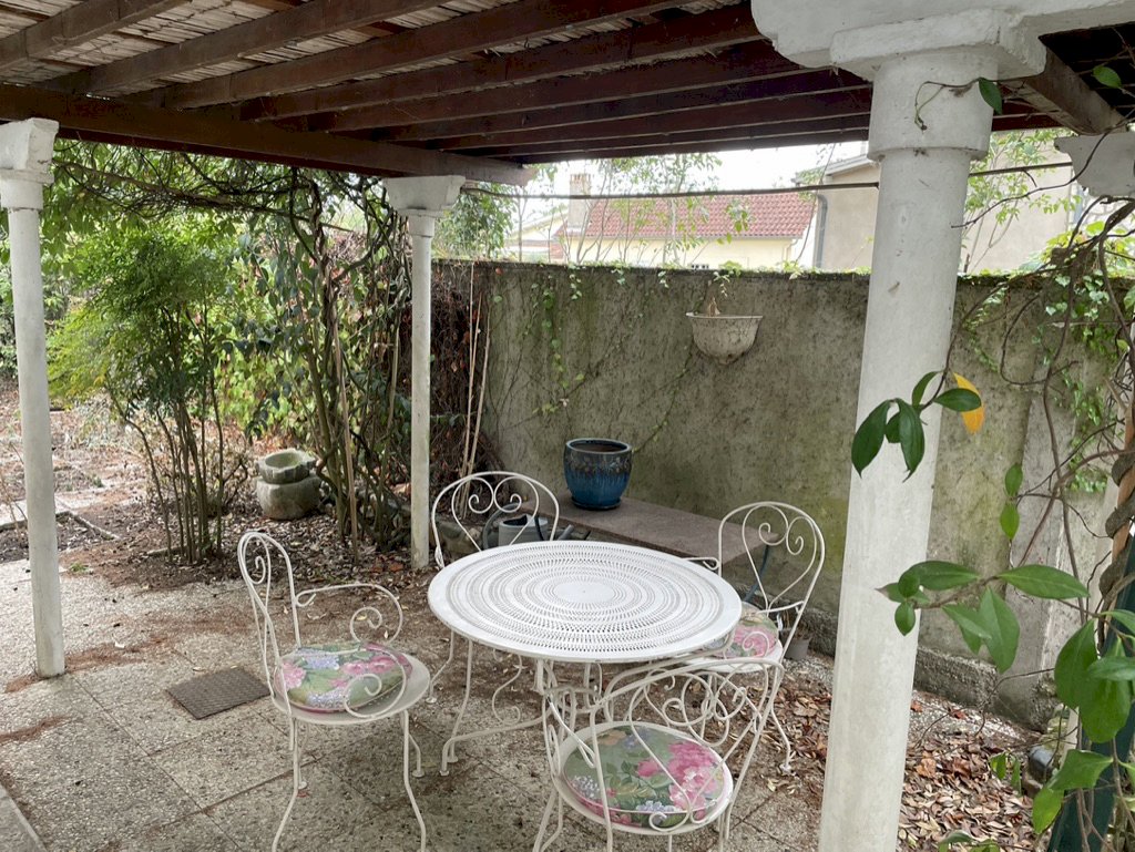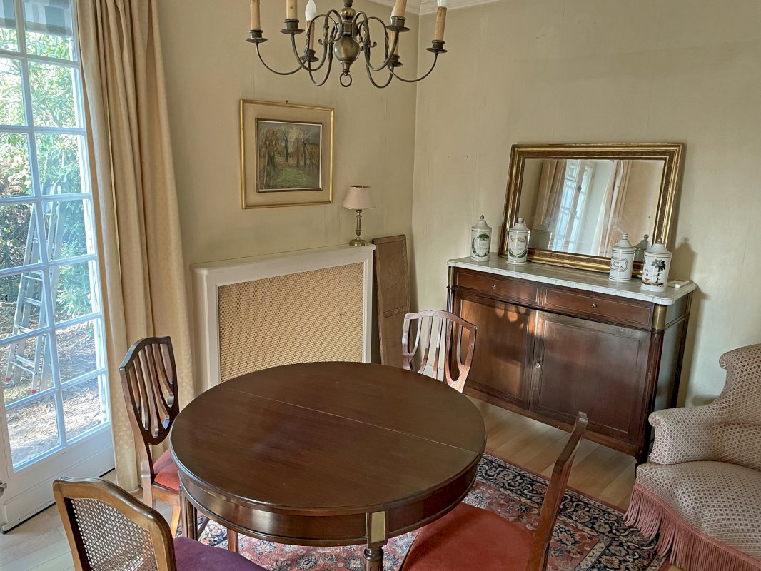 Marmande (47200), maison de caractère 1970, sur terrain de 507 m², 2 étages, séjour et salon lumineux avec stores electriques, salle a manger, cuisine et buanderie equipées, bureau, 5 chambres, balcon, vaste salle de jeu, 2 SdB, 2WC independants, garage couvert attenant, grande cave, jardin clos avec figuier, patio calme et fleuri avec tonnelle, arrosage automatique, tout a l'égout. Air conditionné reversible partout sauf 3 chambres, chauffage central au gaz.