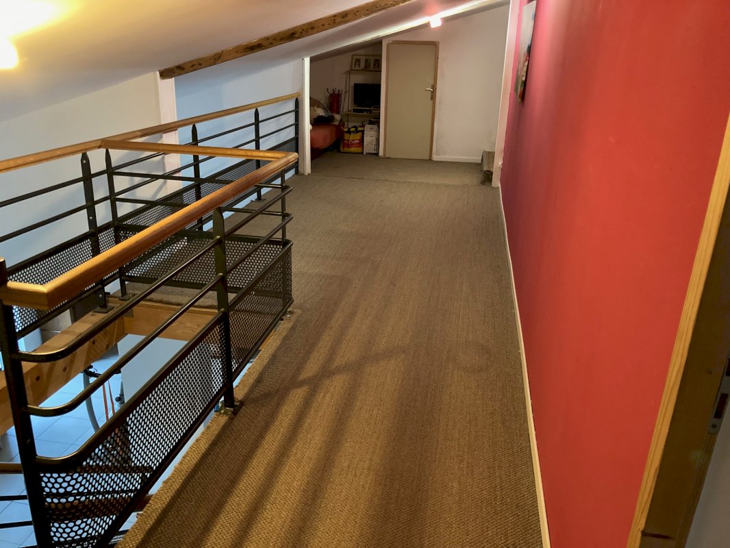 Un élégant escalier en métal et chêne mène à l’étage, où un palier lumineux sert de bureau, agrémenté d’un coin télé ou jeux vidéo. L’étage comprend quatre chambres, dont une suite parentale ouverte sur la piscine, avec douche à l’italienne, dressing, parquet et poutres apparentes. Une salle de bain supplémentaire, un WC séparé et un petit grenier complètent cet étage.