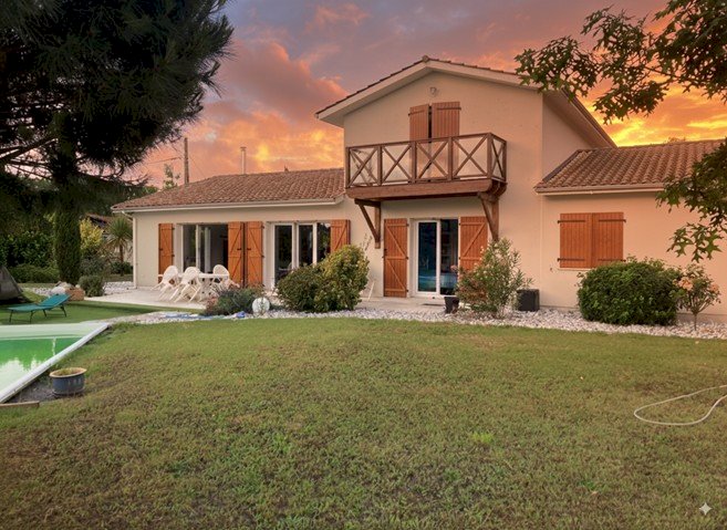 Maison traditionnelle à étage partiel, construite en 2015, offrant une surface habitable d’environ 195 m² (hors annexes) et de beaux espaces extérieurs avec piscine et terrasses.