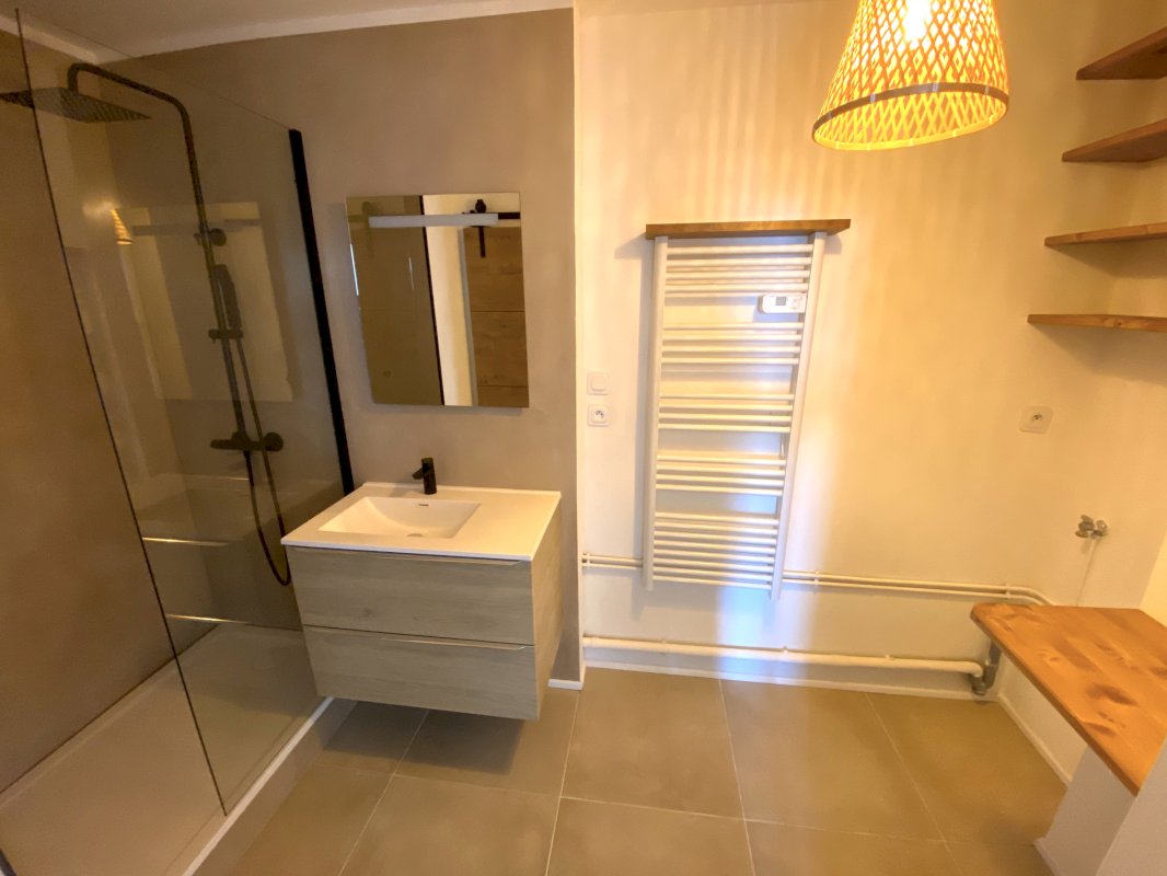 La salle d’eau, moderne, est également équipée (douche avec paroi vitrée, sèche serviette, meuble de rangement, miroir lumineux, étagères en bois massif, branchements pour lave-linge).