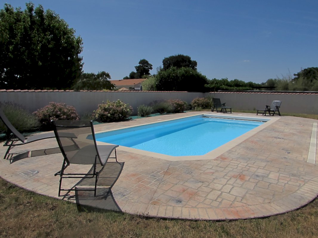 Une piscine de 9 X 4 m chauffée, sécurisée par volet flottant motorisé et caillebotis PVC (aux normes NFP 90-308), entourée d'une terrasse réalisée d'un béton décoratif.