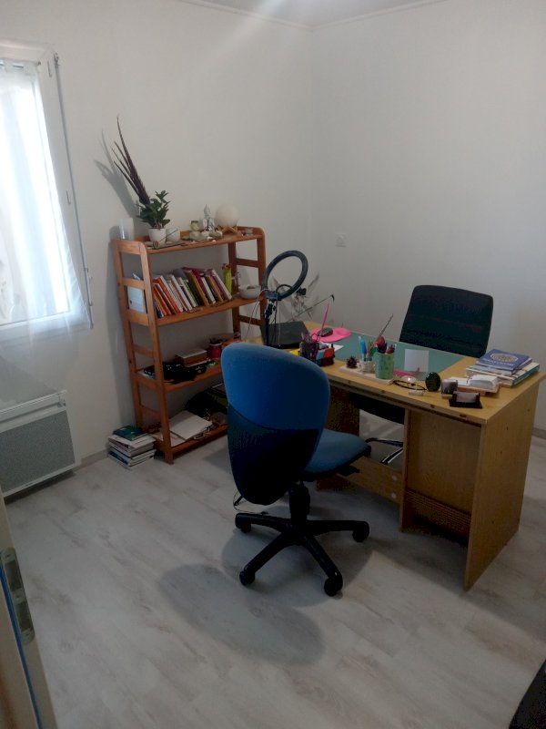 Maison 5 pièces 90 m² datant de 2017, composée d'une entrée avec placard, un grand séjour-cuisine équipée de 44 m² avec un poêle à granules, un couloir desservant trois chambres, un wc avec lave-mains et une salle d'eau.