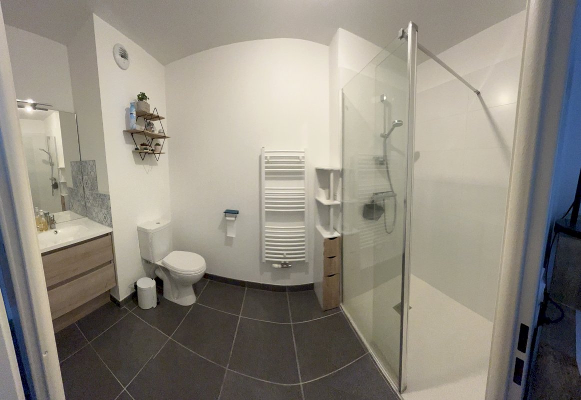 Une salle de bain avec douche et toilettes (PMR).