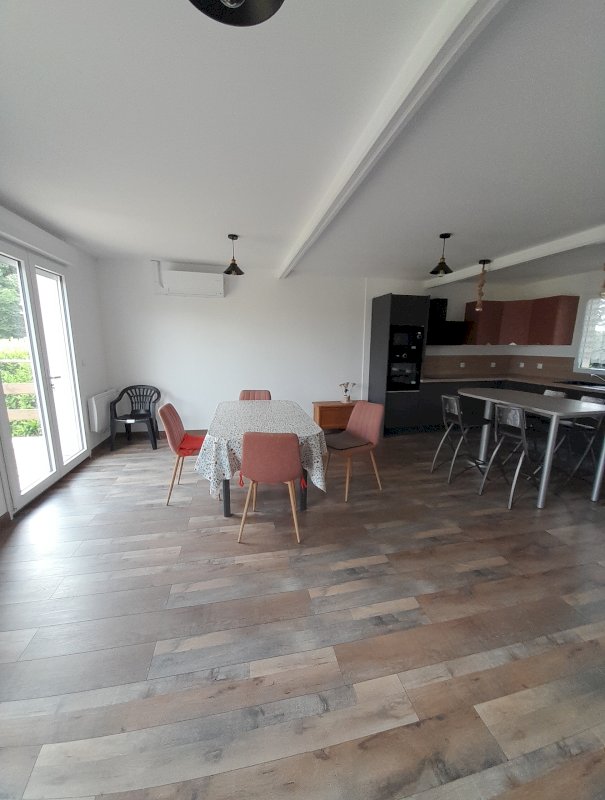 Dans petit village à Ozillac, maison en ossature bois de 2024 comportant une grande pièce à vivre et 2 chambres et une 3ème chambre est possible facilement, salle de douche, plus salle de bain, cuisine aménagée, avec terrasse donnant sur un jardin avec piscine water-air de 20 m3.