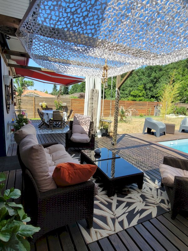 Grande pièce de vie avec cuisine ouverte équipée et cellier traversant (entrée-cuisine), donnant sur le jardin. Grande terrasse bois dont une partie couverte, piscine et local technique.