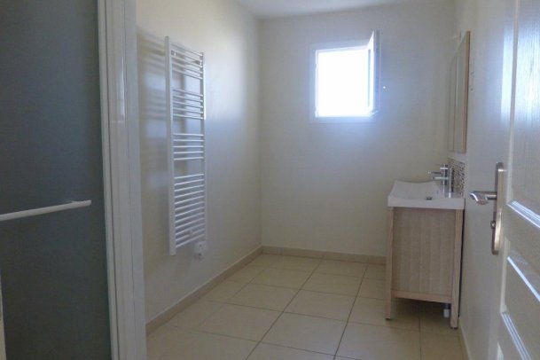 3 chambres dont 2 avec placard, 1 salle d'eau, wc séparé, séjour, cuisine aménagée comprenant , pland de travail, évier, four ( neuf ) plaque induction hotte, cellier, préau de 24m2 avec sol béton poreux, fermé coté sud.